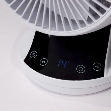 Na základně přístroje jsou umístěna dotyková tlačítka a digitální displej, na kterém se zobrazuje aktuální okolní teplota, stupeň výkonu a nastavení časovače.